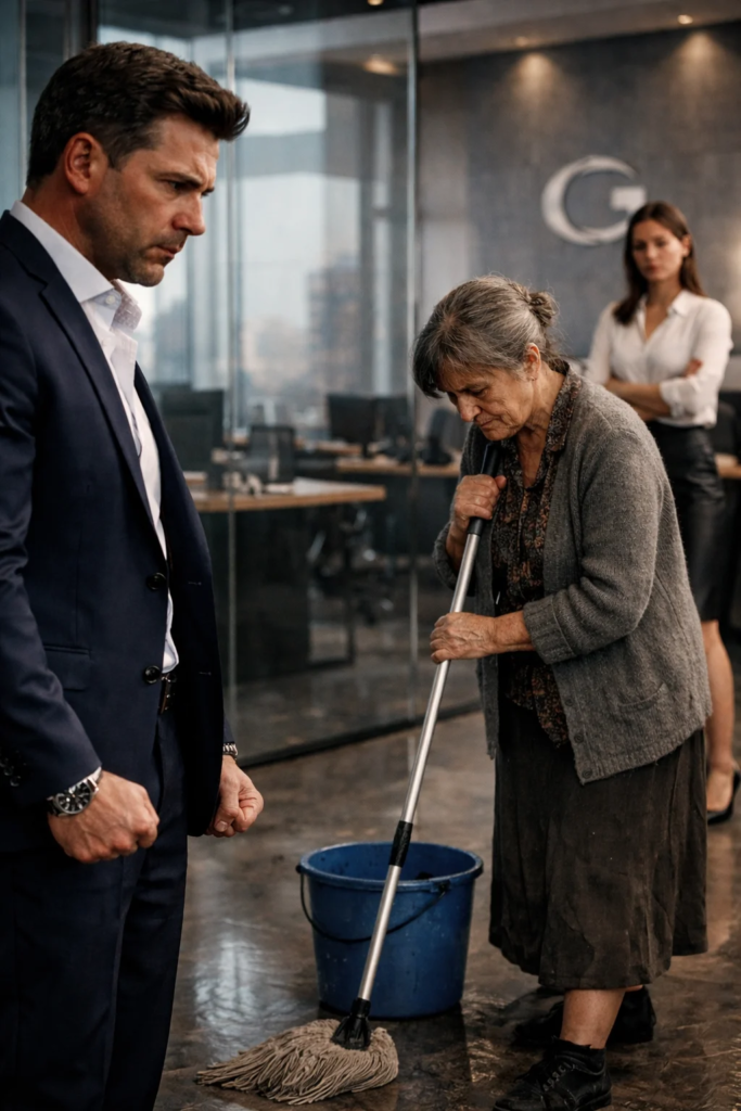 En medio del moderno despacho, entre paredes de cristal, escritorios impecables y muebles costosos, vio una escena que jamás habría imaginado. Su madre estaba allí. Con un cubo de agua y una fregona en las manos, limpiando el suelo como si fuera invisible para todos.